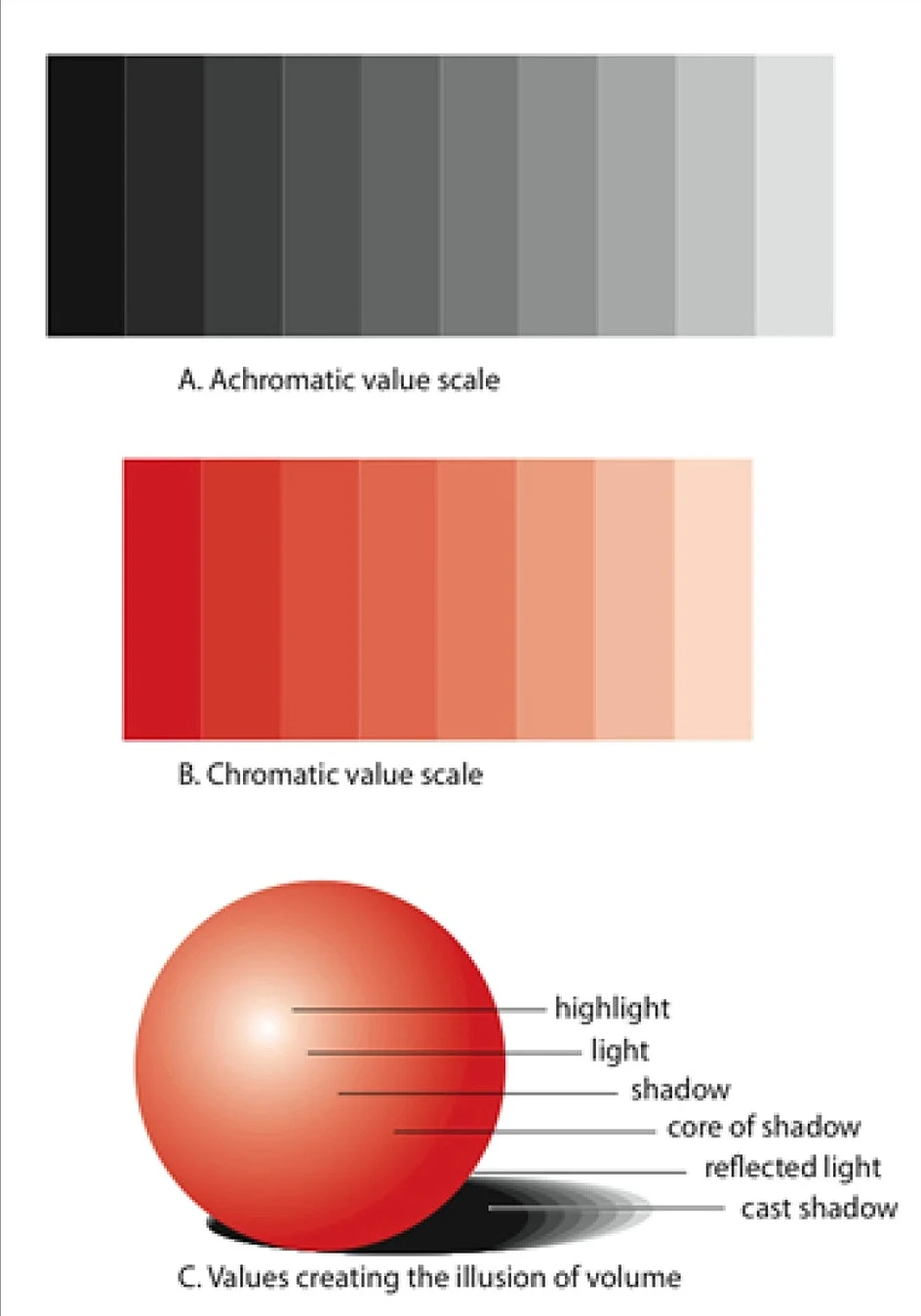 Value in color, as a range from light to dark, is similar to shading or modeling a form in black and white. If the artist wants to create a three dimensional form with color, he or she needs to understand how to adjust the value of the color in order to create a balanced gradation of tones. By paying close attention to the value of a color, an artist can create the seamless illusion of form in space.